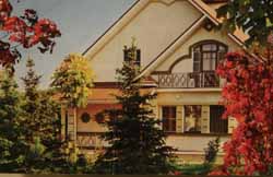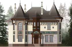Этот дом напоминает старинный французский замок. Коттеджи в стиле модерн отличаются использованием в декоре растительных мотивов, а также богатством орнаментов и преобладанием в них изогнутых плавных линий. Неповторимый облик фасаду придают монументальные башни, увенчанные остроконечными крышами, и величественные террасы, украшенные колоннами, арками и нарядными балюстрадами, поражающие воображение роскошью и величием.